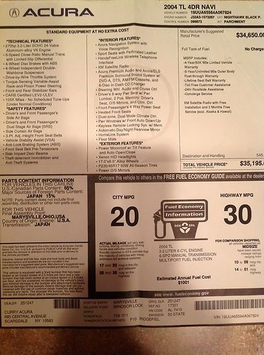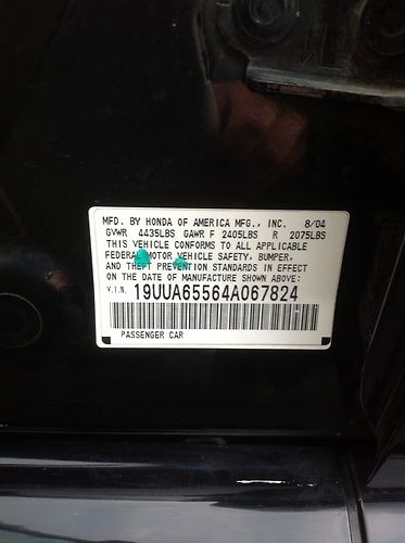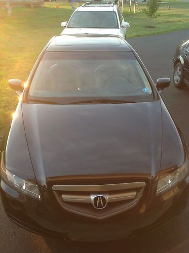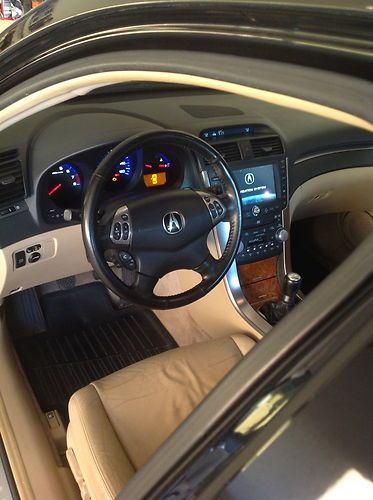 2004 Acura TL 6 Speed Manual Transmission. 270 hp 3.2-liter SOHC 24-Valve Aluminum-alloy V6 Engine. 6 Speed Manual Transmission. 153,148 miles. Nighthawk Black, Tan Leather seats, Heated front seats, Navigation Touch Screen),Power windows and seats, XM SAT radio, 6- Disc in-dash CD player, Steering wheel audio and cruise control, Dual zone climate control, Keyless locking remote with memory, 2 sets of keys, carpet and rubber TL floor mats, HandsFreeLink wireless telephone, Xenon HID headlights, Power o/s mirrors, Power moonroof, Anti-theft system, VSA, ABS braking system. New tires in the last year (see photo). New inspection (8/13). Includes all original paperwork. Car shows normal wear and tear. Paint in excellent condition. No rust!