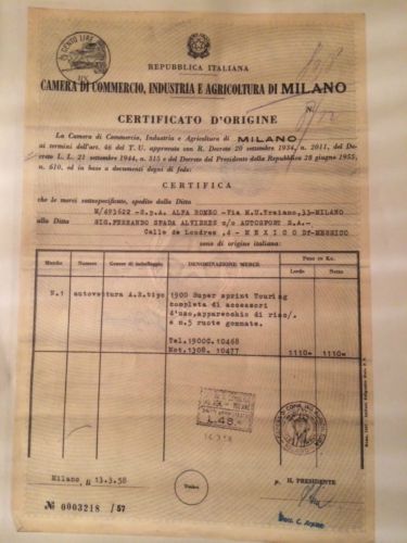 Chassis Number 1900C 10468 Engine Number 1308 10477 One of the most original and unmolested 1900CSS Touring Coupe to be found, now offered for sale after years of storage. A rare opportunity of a super original and unrestored Superleggera 1900CSS Alfa Romeo Rare matching numbers car. Original Alfa Romeo factory invoice and dispatch document dated 4.3.1958 Original 'Certificato D'origine Republica Italiana' document dated 13.3.1958 This car has been in one long ownership for many years. It was delivered new to Mexico, and there is evidence of racing or event participation by the plaques / stickers on the rear windshield. The car is totally original and complete, with the exception of the air filter and front side lights lenses. There is a slight front damage that will need some bodywork. Structurally it is in extraordinary straight and rust free condition. The floors and sills are amazingly clean and straight, as the rest of the inner frame and outer shell. Some light rust in trunk floor and spare wheel well. The interior looks to be redone years ago in black velvet, but all is clean and tidy including the beautiful dash with all switches and original radio. Car located in our stables in Surrey UK. Will help to ship worldwide. Please feel free to ask by email of phone +44 (0)7557908093 |