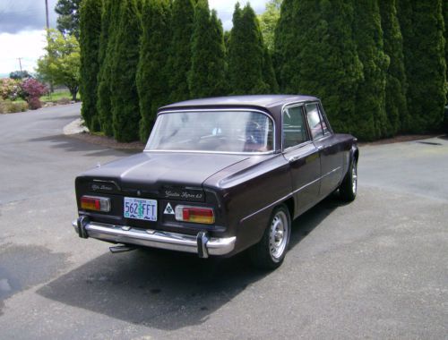 For sale, a mechanically pristine, classic Alfa Romeo sedan. This car is a worry-free daily driver in need of a cosmetic overhaul to make it an exceptional example of the type. As a 1300cc Super, this car has the factory, dual side draft carburetors feeding the free revving alloy twin cam engine. The car is solid and a joy to drive with a smooth shifting 5-speed. The tires are almost new. Besides the paint needing refreshing, there are only three additional flaws with this car; a small leak around the windshield on the passenger side, some staining of the headliner and the missing prop for the trunk lid. As you can see from the photos, this car has a straight, solid body. For those not familiar with the type, the boxy shape is as efficient as it is attractive. It features details including a wraparound windshield, small frontal area, fluting and a Kamm tail, the latter which was successfully used on contemporary racers – a “coda tronca” for the family sedan. I brought the car in from England. Prior to that, the car was owned by a private party in Italy. |