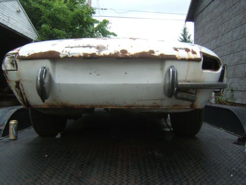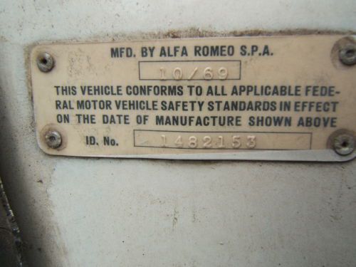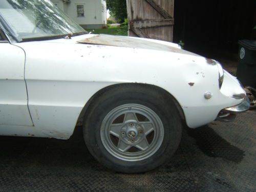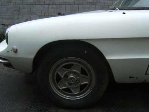 1969 Alfa Romeo Duetto. Might be a Canadian or Euro car, has the round side markers? Pretty rusty and weathered but savable for the motivated. NO TITLE Bill of Sale only. Bill of Sale only! Car was driven onto a trailer less than a year ago using an auxiliary fuel tank. Since that time a good used factory fuel tank was installed but not hooked up yet. I have made no attempt to start the car now. I bought this from a long term friend, he says it actually ran good when put on his trailer. IE I think the motor is decent. The trim pieces not on the car are in the trunk: bumpers, windshield trim and taillights. Also the airbox. No soft top frame. True miles uncertain. Correct steel wheels included. Nice Campy 5 stars on the car but the lugnuts/bolts are not correct. Extra trunk lid in slightly better condition included. Please have a good look at the photos, I can try to get others if needed. What you see is what you get, please ask questions if uncertain. Thanks for looking!