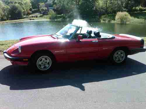1987 ALFA ROMEO SPIDER. GLOSSY RED PAINT WITH BLACK INTERIOR WITH RED STITCHING ON THE SEATS. BLACK TOP. THIS CAR IS A GREAT LITTLE DRIVER!! STARTS RIGHT UP, SHIFTS AND RUNS WELL. THIS CAR CAME FROM CALIFORNIA TO TENNESSEE. JUST PASSED EMISSIONS TESTING IN TENNESSEE FOR THIS YEAR. APPEARS THE CAR HAS BEEN REPAINTED AT ONE TIME. NO KNOWN ACCIDENTS. THE CAR SHOWS WELLS BUT IT DOES HAVE SOME MINOR DINGS AND SCRATCHES. THE A/C IS BLOWING WARM. I AM TOLD IT COULD HAVE A LEAK IN THE SYSTEM. THE ODOMTER STOPPED WORKING WITHIN THE LAST 6 OR 8 MONTHS. THE MILES READ 120,000 AND SOME CHANGE. I BELIEVE THE MILES ARE WITHIN 1,000 MILES OF WHAT THE ODOMETER. THE TACH AND OTHER DASH INSTRUMENTS ARE WORKING.