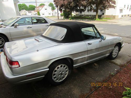 I purchased this car almost 2 years ago with the intention to get it road worthy . The car was damaged on the right rear just below the tailight .The person i bought it from fixed it and left it sitting for several years .Then he posted it on ebay in 8/2011 when i bought it. The car was to my knowledge, a Florida car and was serviced at Alfa Veloce in Miami. Service sticker under the hood. The car runs and drives. But as i said has been off the road for several years and needs to be driven .Work i've done. Complete respray in original silver , reupholstered the seats in leather. replaced the clutch master and slave cylinder.replaced large intake hose,new door weather stripping, new badging , new tires,currently fitting a dash cap and replacement door panels, polished rear top plastic window.The car will need some additional work but i took care of the big ticket items.All series 4 spiders have power steering and this has a/c but there is no belt and i have not attempted to trouble it. I am actively working on it and working to fixed the drivers side power window and radio.nothing major. This would make for a real nice driver with a little $ and elbow grease. Car is located in Rhode Island and currently garaged. Buy it summers coming . Happy bidding.