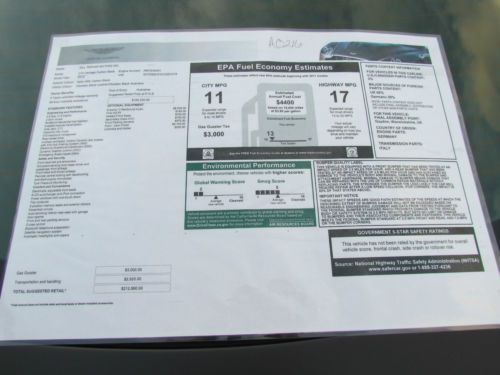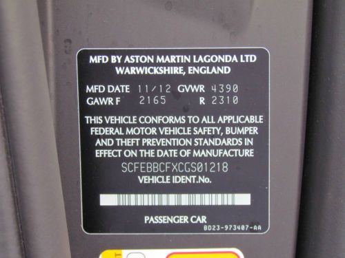 $212,660 MSRP. 2012 ASTON MARTIN VANTAGE COUPE 6.0 LITER 510 HP V12 420 LB-FT 6-SPEED MANUAL TRANSMISSION. FINISHED IN SATIN AML CARBON BLACK ($6,745 OPTION) OVER OBSIDIAN BLACK LEATHER/OBSIDIAN BLACK ALCANTARA. THIS VEHICLE FEATURES MASSIVE CARBON CERAMIC DISK BRAKES WITH ELECTRONIC BRAKE FORCE DISTRIBUTION, DYNAMIC STABILITY CONTROL, EMERGENCY BRAKE ASSIST, SATELLITE NAVIGATION SYSTEM, ELECTRICALLY ADJUSTABLE FRONT SEATS WITH 3 MEMORY POSITION, EXTERIOR POWER FOLD MIRRORS, BLUETOOTH TELEPHONE PREPARATION, AND FRONT AND REAR PARKING SENSORS. OPTIONAL EQUIPMENT INCLUDES: 1000 WATT BANG & OLUFSEN BEOSOUND AUDIO ($8,330 OPTION), HEATED FRONT SEATS, SECONDARY GLASS ECU, FRONT PARKING SENSORS, SATIN FINISH PAINT, UMBRELLA AND HOLDER, FIRST AID KIT, PLUS ALL OTHER STANDARD EQUIPMENT. FOR MORE INFORMATION PLEASE CONTACT: HENRY FERNANDEZ. CELL # 305 815-1290. OFFICE # 786 391-4369. |