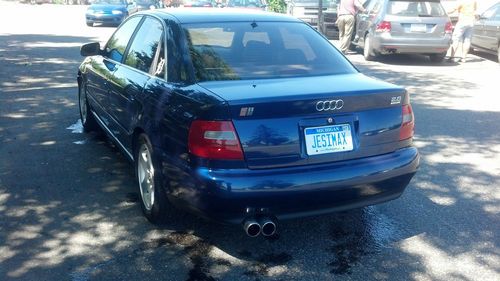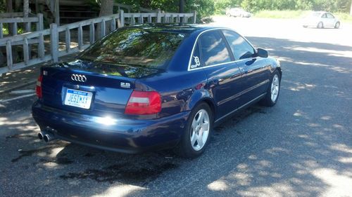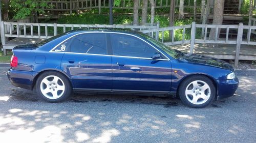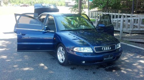 This is a Blue 1999 Audi A4 Quattro 2.8L V6. 5 speed. 143,000 miles. Has every option that they offered that year. Car runs and drives great. It has modified exhaust, stereo, intake, Eibach Racing Springs. Tires have 60-65% left on them. This car is in good shape for how old it is. It isn't perfect, but I try to keep it as nice as possible. It gets cleaned inside and out twice a week. and all repair work is done when necessary. I have receipts for everything.Tons of new parts on it because I always fix the stuff that I need to right away. It does have 3 minor issues that should be mentioned. However, they are not detrimental or affect the drivability, otherwise I would have fixed them.1.The ABS sensor has a communication error, but the ABS still works just fine. 2.The secondary air pump does not work, however that is strictly used for emissions. Does not affect the car. 3. Cruise control does not work(never has). 4. It Burns a very minute amount of oil. Doesn't burn enough to ever add oil. This car has been great for me and I actually just purchased a newer version of the same car because I've loved this one so much. The car is very quick and fun. Great summer car with the sunroof and leather. It will be left pre wired for a subwoofer, but the subwoofer will NOT be included in the sale. My name is Jess, and I am an open book about this car. I am more than happy to answer any and all questions via call or text @ 906-298-1671. This will be pick up only. Must pay by cash or money order.