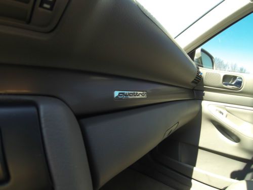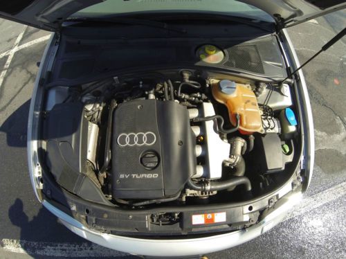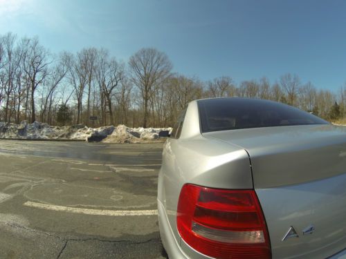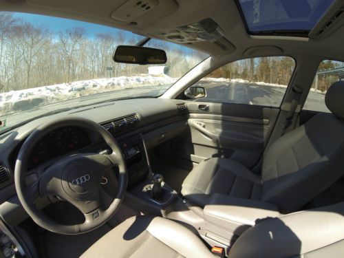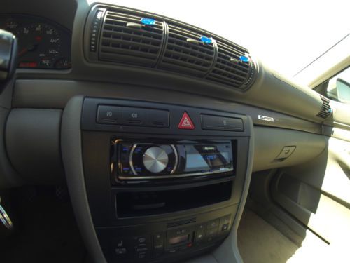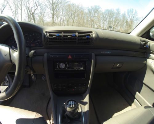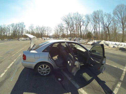 2001 Audi A4 1.8T manual Quattro complete with sport and winter packages. This is an extremely clean A4 was also an Audi Certified Pre-Owned vehicle, used as a daily driver. Garage kept with very structured maintenance intervals. Four new tires, two new coil packs, and a new battery installed in Dec 2013. Owner has upgraded to a new A4 and is looking to sell to only serious buyers. Specs 2001 Silver 1.8L Turbo 5 Speed manual Quattro (AWD) Grey with grey leather Interior & Carbon fiber trim 139,150 Miles Features and Option Audi Sport Package Audi Winter Package 17” Aluminum Audi Sport Wheels Leather Seats Xenon HID Self Leveling Headlights Fog Lights 35% Tint Pioneer Head Unit Iphone/Ipod interface XM/AM/FM/CD Stereo Alpine Type-R speakers Heated Mirrors Heated Seats Sunroof HomeLink Air Conditioning ABS Adjustable steering wheel Full size spare 2 switch blade keys Keyless entry Cruise control Front, Curtain, and rear airbags Power Lumbar Support Second row folding seats Integrated Audi Ski pouch