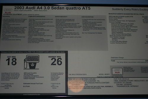 I am selling my 2003 Audi A4 Quattro 3.0L Automatic with 90,900 miles. I am the second owner and have owned the car for the last two years. I bought the car from Fletcher Jones Audi in Chicago, whom had accepted it in as a trade from the original owner. This car has only seen one Rochester winter. There is nothing wrong with this car, mechanically and visually it is in great shape for a 10 year old car. I have performed any and all factory scheduled service on this vehicle. at 75,000 miles I did:
