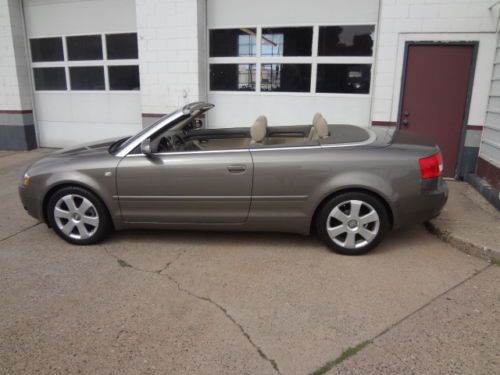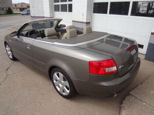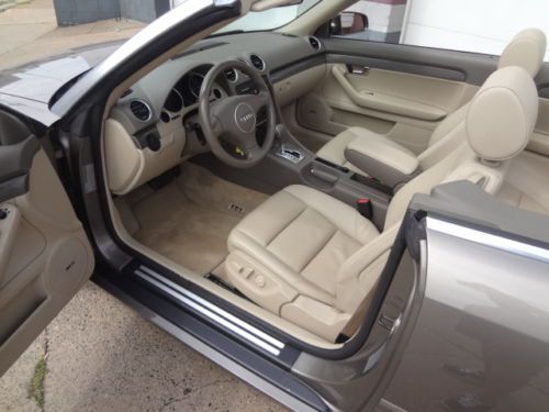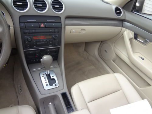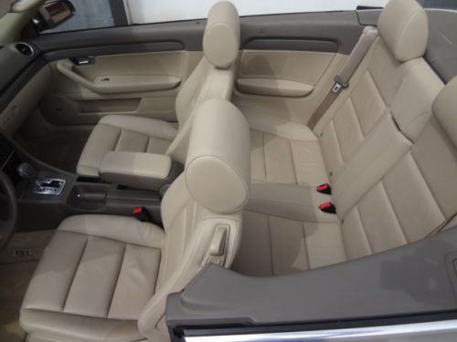 Very nice clean one owner low mile audi a4 cabriolet. 1.8T CVT. Alpaka Beige Pearl Effect/ Beige Roof, and Beige interior. Comes with premium package which consists of; leather seating surfaces, homelink remote transmitter, wind deflector, 12 way power front seats, infotainment package, bose premium, xm satellite radio, 17inch cast alloy wheels, heated front seats.