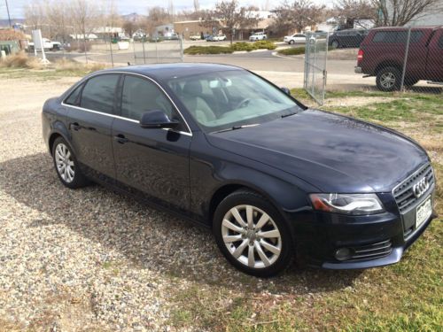 UP FOR SALE IS A 2009 AUDI A4 ALL WHEEL DRIVE WITH ONLY 52380 MILES ON IT. IT IS GREY LEATHER INSIDE WITH METALLIC BLUE OUTSIDE. THIS CAR JUST RECEIVED NEW FRONT BRAKES, HAS GOOD TIRES AND HAS HAD ONLY ONE OWNER. CAR HAS THE CLASSIC DAY TIME RUNNING LIGHTS. OWNER HAD ONE DOG AND DID NOT SMOKE CIGARETTES IN THE CAR OR AT ALL. THIS CAR HAS BEEN GARGE KEPT FOR ITS LIFE AND HAS LOTS OF HIGHWAY MILES ON IT. ENGINE IS STRONG, TRANSMISSION IS GREAT, ONLY USED FULL SYNTHETIC MOTOR OIL AND HAS DONE A OIL CHANGE ON TIME EVERY TIME. PLEASE SEE PICTURES, INSIDE IS MOSTLY CLEAN, FLOOR NEEDS A BETTER CLEANING AND NEW FLOOR MATS. WHOLE INSIDE COULD USE A DETAILING FROM A PRO TO GIVE A NEWER FEEL. THIS HAS BEEN A GREAT CAN AND WILL RUN FOR MANY MILES FOR SOMEONE ELSE. RUNS IN THE SNOW REALLY WELL WITH THE AWD. PLEASE ASK ANY QUESTIONS.