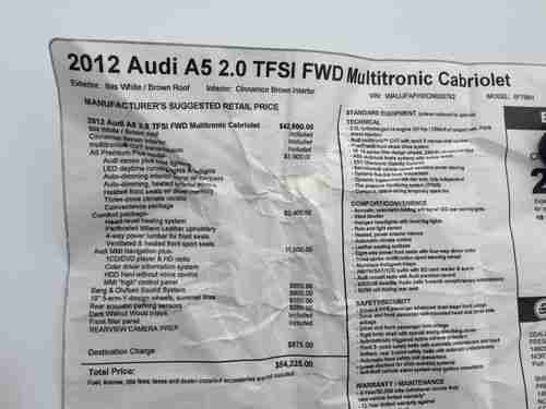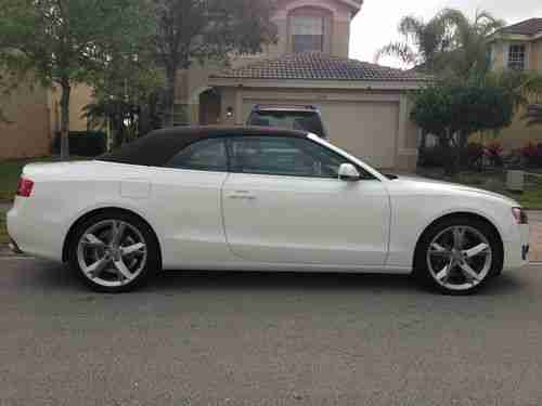 You are bidding on an almost brand new Audi A5 2012 Convertible Premium Plus edition. Vehicle was used at my vacation home only 3 months yearly. Its fully equiped with the comfort package also. it was only driven to malls and beaches around the miami area. this models costs about 58k with taxes and you can save about 10k on a car thats only been driving 5000 miles! Car also never had any issues and was only taken to dealership to install rear view camera option that was pre installed.