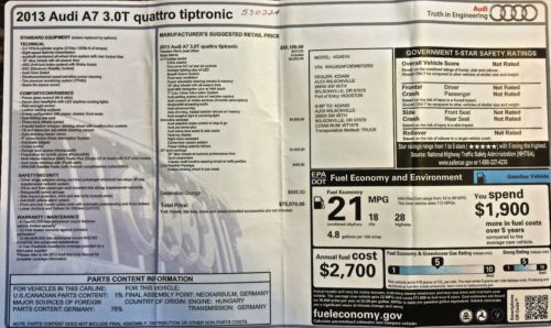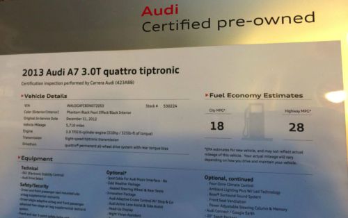 2013 Audi A7 Quattro Prestige Edition Certified 6 year/100,000 Mile Factory Warranty Only 8753 Miles No Accidents or Paintwork Ever! As close to new as you can get! This is my personal car and has been well taken care of. Always garaged in a private garage and in PRISTINE condition! - Phantom Black Metallic with Black Interior Sticker was over $75,000 and my car has only 8,753 miles This is a Fully Loaded Prestige A7 Quatrro with the following options: Prestige Package Quattro All-Wheel drive for excellent Snow or Rain traction S Line Exterior Push Button Start Innovation Package - includes Adaptive Cruise Control with stop and go (this is an amazing feature as the car will literally drive itself) Head Up Display- projects speed, etc on the windshield (no need to look down while driving to check the speed) Night Vision Push Button Start Cornerview Camera Adaptive Side Assist (blind spot protection) Active Lane Assist 20" Sport package with 20" wheels and tires Cold Weather package My car is located in the San Francisco Bay Area. I'm happy to pick you up at the airport if you are coming from out of the area or meet with an auto transport company. PLEASE CALL 925-980-1135 WITH ANY QUESTIONS. |