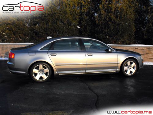 This is probably the cleanest 2004 Audi A8L Quattro AWD on the market right now, vehicle is absolutely stunning! Interior/exterior looks fantastic.This is a premium vehicle that comes with a full dealer service history at Audi Exchange in Highland Park, IL, and a clean Carfax. We also just performed its scheduled major service in December, replacing the rear main seal, timing belt/water pump and component kit, and many other items were replaced. This is a 2 owner, non-accident, non-smoker beauty. It is loaded with the Cold Weather Package, Comfort Package, Alcantara Package (cooled seats, Alcantara headliner etc), park distance sensors, Navigation and many more features. It is also equipped with ASR and ESP Stability Control and Quattro AWD systems; they work flawlessly and make this one of the best handling vehicles in wet and snowy conditions. VIN: WAUML44E54N010020 Vehicle Options: - Front & Rear Parktronic - 4.2L DOHC V8 engine - 6-speed Tiptronic Automatic Transmission - Adaptive Air suspension - allows vehicle to be raised by up to 2" or lowered for highway cruising - Dark Blue leather interior with gorgeous wood trim - Power Heated & Cooled, 4-way Memory front seats with power lumbar and leg extensions - Heated rear seats - Heated mirrors and steering wheel - Power rear window shade - Power trunk - Rear side window shades - Keyless entry - Cruise Control - Dual Zone Digital Climate Control - Front and rear fog lights - Navigation with voice guidance - Premium 12-speaker Bose Surround Sound Audio system with XM and Sirius Satellite Radio - 6 Disc in-dash CD changer - Premium 18" Alloy wheels - Full-size spare wheel and tire - First Aid kit - Auto dimming and folding exterior mirror - Long wheelbase - 5" stretch over a conventional A8 - Bi Xenon Headlights w/ Adaptive levelling - HomeLink® 3 channel remote transmitter located in driver's sunvisor Vehicle Factory Packages: - Cold Weather Package - Heated driver and passenger seat; Front facing heated rear seats; Heated steering wheel; Rear seat center armrest with ski bag; headlight washers - Alcantara Package (Special Order) - Suede headliner upholstery - Convenience Package - Driver and passenger ventilated seat; Rear electric blind; Vanity mirror with rear; Low tire pressure indicator; Electric trunk/hatch pull down Safety Features: - ABS Brakes with EDL (Electronic Differential Lock) System - ASR (Anti-Slip Regulation) system - ESP Electronic Stabilization Program with hydraulic Brake Assist - Quattro Permanent All Wheel Drive System - Dual Front and Side Air Bags More Info on the vehicle This is not your typical luxury sedan; when this car debuted in 2004 it was the most advanced vehicle on the market, and even by today's standard it's more like a spaceship than a vehicle - the car is about 1200lbs lighter than a comparably sized luxury sedan, due to the extensive use of Aluminum. The whole chassis is made of the Audi "Spaceframe" - its made of only aluminum and composite materials. And even with a V8 engine and full time AWD, the car regularly gets 25-27MPG on the highway in warm weather, a true testament to the engineering that went in. And of course, this car doesn't rust! The level of engineering that went into this vehicle is astounding. Every little detail shows that a lot of thought and R&D went into its creation. From the 2" thick two-layer floor carpeting, to the innovative sound deadening materials used in the fender liners, to the exquisite use of materials throughout - no expense was spared. Even the Bose sound system is the best we've ever heard in a factory setup. The bass, mid and high-tones do not lose their clarity even when the volume is turned up to max. There is no crackling of the base, no mid-tone fade. Maintenance and Service History: In addition to all of the regular maintenance, we also performed a major engine-out maintenance recently (this was the owner's car, and he spared no expense on it): - Replaced timing belt, water pump, tensioners - New Rear Main seal and cover gasket - New Valve Cover gaskets - Rebuilt the intake plenum butterfly mechanism - Replaced coolant hoses - Replaced oil filter housing coolant pipe and gaskets - New power steering hoses - New front sway bar links - Flushed cooling system - Flushed power steering system The vehicle currently has 198,250 miles on the odometer This is a highway-driven car that has not seem much wear and tear caused by city driving. If you are looking for a premium Audi and settle only for the best, this is your vehicle! We will provide you with the clean Carfax Report upon request. Call or email us to schedule an appointment, and you will not be disappointed! Why buy from Wisconsin? There are more than one reasons; generally speaking, used vehicles in Wisconsin tend to be in better shape then their counterparts in the Chicago area, perhaps owing due to the fact that there is less city driving being done here. Another big reason is that as a consumer, you are better protected when you buy from a dealer in Wisconsin, because the laws protecting you from hidden vehicle damage are stricter. For example, we have to disclose any damage we can reasonably know about on the window sticker when selling a car - that includes oil leaks, issues with the suspension, engine and transmission, brakes etc. So even though we may sell a vehicle AS-IS, we have to disclose any issues by law. In Illinois, it is up to the consumer to inspect the vehicle, and as is often the case, end up with a car in a need of a lot of repairs. At Cartopia, we go a step beyond the requirement - we do a full inspection on each vehicle before offering it for sale, and repair any issues it may have. All of the vehicles that we sell are in top shape and do not need any work, so you can be confident that you are purchasing a good vehicle well worth its price! About Us If you are looking for a clean, well taken care-of used vehicle, you will not be disappointed! We specialize in European and Asian Im
