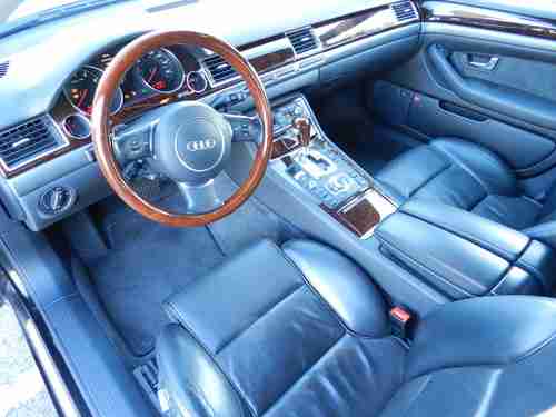 Stunning, Executive Owned Audi A8 Quattro. You all know how rare this car is in the USA. It's sleek elegance makes a major statement from every angle. The 4.2Liter V8 power house with the Adjustable suspension coupled with Quattro AWD equals HANDLING that you have to experience to believe. She hugs the road secure and sure as if on rails. Transmission is supper smooth! No complaints! No matter what the weather arrive safe and in style. Always opulent but never decadent. A8! Super clean, non smoker, no children transported in her...she is SWEET! Surprisingly good on gas when on the road too. The best options package around lots of car for the money!