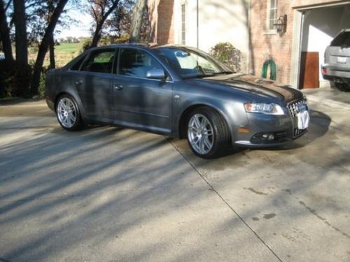 2008 was the last year for the V-8 powered Audi S4. 2nd owner since 2009, adult driven, non-smoker, never wrecked, exceptionally clean, always garaged. All maintainence completed by Audi. Dolphin Gray Metallic exterior with two tone charcoal interior w/Recaro seating. Upgrades include ceramic brake pads and cross drilled performance rotors(2013), Continental Xtreme DW summer tires(late 2012). A set of Blizzacks snow tires on rims w/TPMS sensors included with sale. Quatro AWD, 6 speed automatic transmission w/paddle shifters, 4-wheel disc brakes, 4-wheel ABS, dual front airbags, frt& rear head airbags, traction & stability control, TPMS system. 4.2 V-8/340hp, dual exhaust w/quad tips. HID Xenon adaptive headlamps w/auto leveling and fog lamps. Options: Cold weather package (heated seats and mirrors) convenience package (factory alarm, keyless entry, Home link, auto dimming). Satelite radio w/Bose Premium Sound w/Ipod MP3, SD card & CD player, bluetooth data link for hands-free phone and built in navigation. Leather Recaro seating w/Alcantara inserts, carbon fiber trim, rain sensor wiper system, rear parking sensors, power sun roof, cruise control, p.seats, p.windows, tilt steerling, p.door locks and rear defogger. Top safety pick and top 5 reliability index through Edmonds, no dissappointments.