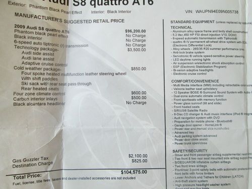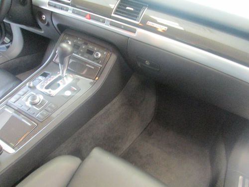 Options: Technology Package, Cold Weather Package, Four Zone Climate Control, Black Alcantara Headliner, Carbon Interior Inlays, Audi Navigation System with DVD, SIrius Satellite Radio, Front Heated Seats, HomeLink, Audi Parking System Advanced, Power Door Close Assist, Power Trunk Open/Close, 6 Disc CD Changer and Audi Music Interface, Front Sport Seats with Memory Function, 12 Speaker BOSE Surround Sound System, Valcona Leather Seat Upholestry, Multi Media Interface including Retractable Screen, Sunroof, 4-Wheel Drive, Leather Seats, CD Player