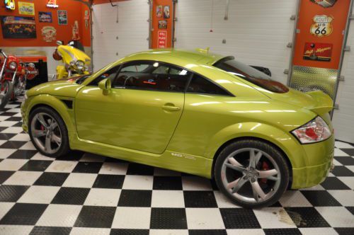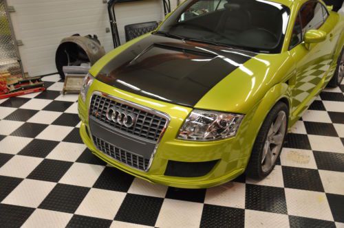 2005 Audi TT, This car has had extensive modifications done. A 5000$ custom paint job is over top of a full OSIR body kit using an A8 grille and 19 inch Audi A6 S Line wheels. A VIS carbon fiber hood along with vented OSIR vented fenders .Aftermarket LED headlights along with clear LED tailights. The car has never been winter driven, the original 17 inch wheels are also included. 22 Fuel Consumption: City: 21 mpg, Fuel Consumption: Highway: 29 mpg, Remote power door locks, Power windows, Cruise control, 4-wheel ABS Brakes, Front Ventilated disc brakes, Cancellable Passenger Airbag, Side airbag, Rear spoiler: Lip, Audio system security, In-Dash single CD player, AM/FM stereo, Radio Data System, Speed Sensitive Audio Volume Control, Total Number of Speakers: 6, Intercooled Turbo, ABS and Driveline Traction Control, Stability control, Privacy glass: Light, Silver aluminum rims, Leather steering wheel trim,Leather/aluminum shift knob trim, Aluminum dash trim, Aluminum center console trim, , Trip computer, External temperature display, Auxilliary engine cooler, Tachometer, Manufacturer's 0-60mph acceleration time (seconds): 8.0 s, Power remote driver mirror adjustment, Heated driver mirror, Heated passenger mirror, Power remote passenger mirror adjustment, Dual illuminated vanity mirrors, Heated windshield washer jets, Power remote trunk release, Front reading lights, Anti-theft alarm system, Leather seat upholstery, Front sport seat, Rear bench, Fold forward seatback rear seats, Tilt and telescopic steering wheel, Transmission gear shifting controls on steering wheel, Speed-proportional power steering, Suspension class: Regular, Interior air filtration, Automatic front air conditioning, Cargo area light, Max cargo capacity: 24 cu.ft., Vehicle Emissions: LEV, Fuel Type: Premium unleaded, Fuel Capacity: 14.5 gal., Instrumentation: Low fuel level, Clock: In-dash, Self-leveling headlights, Coil front spring, Regular front stabilizer bar, Independent front suspension classification, Strut front suspension, Front Independent Suspension, Coil rear spring, Rear Stabilizer Bar: Regular, Semi-independent rear suspension, Torsion beam rear suspension, Front and rear suspension stabilizer bars, Variable intermittent front wipers, Steel spare wheel rim, Spare Tire Mount Location: Inside under cargo, Black grille, Center Console: Full with storage, Curb weight: 2,987 lbs., Gross vehicle weight: 3,770 lbs., Overall Length: 159.1", Overall Width: 73.1", Overall height: 53.0", Wheelbase: 95.4", Front Head Room: 37.8", Rear Head Room: 32.6", Front Leg Room: 41.2", Rear Leg Room: 20.2", Front Shoulder Room: 55.6", Rear Shoulder Room: 48.1", One 12V DC power outlet, Seatbelt pretensioners: Front, Door reinforcement: Side-impact door beam, Engine immobilizer, First aid kit, Cargo tie downs, Floor mats: Carpet front, Rear area cargo cover: Rigid, Cupholders: Front, Door pockets: Driver and passenger, Type of tires: Performance, , Rear door type: Liftgate, Body-colored bumpers, Window grid antenna, 2 Door,4x4, Air Conditioning, Alloy Wheels, AM/FM, Anti-Lock Brakes, Cargo Area Tiedowns, CD, Driver Airbag, Fog Lights, Front Air Dam, Front Side Airbag, Front Side Airbag With Head Protection, Heated Exterior Mirror, High Intensity Discharge Headlights, Interval Wipers, Leather Seats, Leather Steering Wheel, Locking Differential, Passenger Airbag, Power Locks, Power Mirrors, Power Steering, Rear Defroster, Second Row Folding Seat, Telescopic Steering Column, Tilt Wheel, Trunk Anti-Trap Device