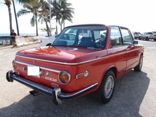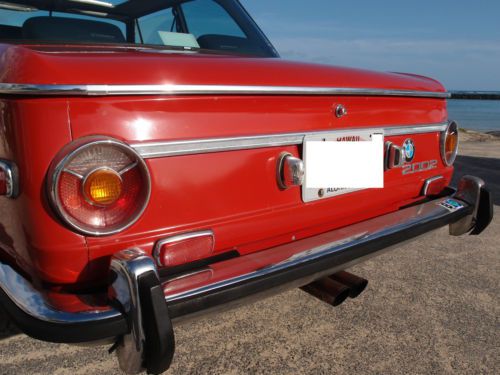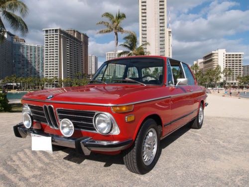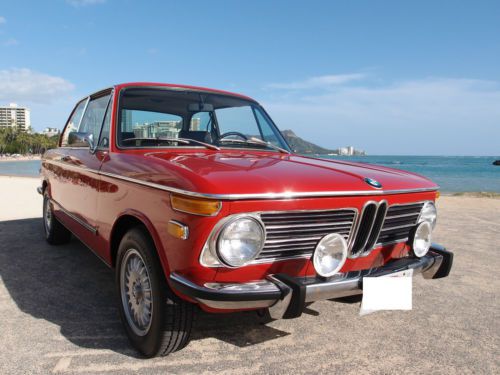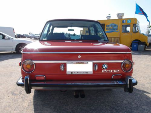 An excellent example of a 1973 BMW 2002, the last model year of the sought after round tail light 2002. This car is Verona Red (Repaint Not original) on Black, with manual sunroof, 14" BMW 320i rims and 4 speed manual transmission. The suspension has been redone and has the Weber downdraft carburetor conversion. The car has rust spots typical for a 2002 but it's in better shape than most. It makes for an ideal daily driver or a great candidate for restoration. Starts up with ease, runs strong and manual transmission goes through each gear easily and effortlessly. Overall it is in very clean condition, both interior as well as exterior. Please look at the photos that I have provided , read my comments below and let me know if you have any more questions. You can reach me at 808-384-5742. PLEASE NOTE: I will pay half the shipping cost from Honolulu to Long Beach (Los Angeles) to the first one who chooses to BUY IT NOW. Conditions & Terms: A bid on this vehicle constitutes a commitment to buy. Absolutely do not bid under any circumstances unless you are committed and capable of purchasing this vehicle! Your bid is a legally binding contract as eBay clearly states. If you are not a serious bidder please do not enter into this legally binding contract! If you have any questions whatsoever please ask them before bidding. I will be pleased to answer your questions. Upon meeting the auction reserve, your bid will be considered a lawfully binding contract. By bidding on this vehicle you are agreeing to these terms and conditions. I have made every reasonable effort to describe this vehicle and used many photographs to help in this description. Please remember that this is a used vehicle. It is not new. The mileage on this vehicle has been recorded at the time of listing and is subject to change. Regardless of my commitment to describe this vehicle in as much detail as possible, there will be imperfections. My failing to mention, for example, an item such as a paint imperfection, an inoperable switch etc, does not constitute refusal of a car by the buyer. Vehicles are complex machines with thousands of parts. Classic & special interest vehicles are broad in their differences and uniqueness. Even though I have attempted to be as clear and concise in my descriptions as possible, the vehicle may have issues that are inherent to a vehicle of its type and/or age. In short, I encourage you to ask questions. I also encourage inspections to avoid any misunderstandings. This vehicle is being sold "as-is", with no warranty, expressed or implied. Vehicle is available for an inspection prior to purchase, and I will be happy to arrange one at the expense of the interested buyer. A non-refundable deposit of $500 is due within 48 hours of the auction close (acceptable via Paypal). The remaining balance is due within 72 hours of the close of auction, unless other arrangements were made. Accepted payment methods are bank wire transfers. Transportation expenses are the sole responsibility of the buyer. I will NOT be held liable for any problems or damages arising from or due to transportation handling. The buyer is responsible for all shipping charges and fees from point of sale to the final destination. In addition, it is the buyer's responsibility to arrange & coordinate shipping, I am willing to assist.