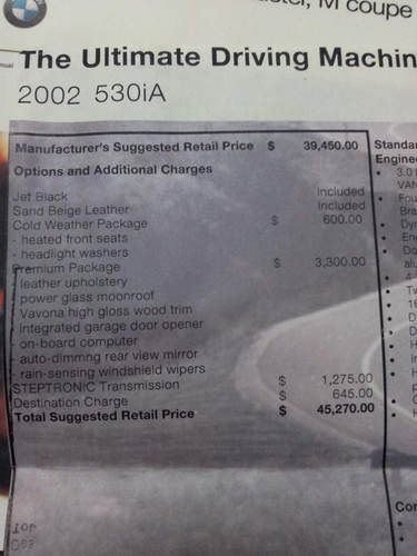 We have owned this very clean nice and comfortable 2002 BMW 530iA for about 5 years. Selling because we bought a minivan for the growing family. More pictures are HERE. It has steptronic transmission. 6 cylinder, RWD. 225 hp. Constantly driven and maintained regularly. Premium package. Cold weather package. 108k miles. We put about 32k miles on the car during the last 5 years. Recent service earlier this year includes new intake CAM sensor, front break, break sensors, thermostat housing, Aux. fan switch, fresh cooland flush, new alternator. Michelin tires all the way around, still about 80% left. Maintenance records available. No warning lights. Engine oil changed with Mobile 1 full synthetic every 5k miles. Last oil change was done about 3K miles ago and you should be good for another 2K. Sunroot. AC ice cold. All power options are working. Front side airbags. Accelerates pretty fast and can do 30 mpg on the highway. Always premium gas. Powerful engine, solid feeling and comfortable quiet cruising at all speeds with good alignment. Whenever there is a problem with the car, it is fixed right away.