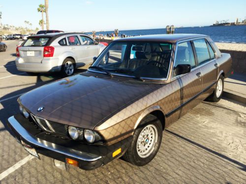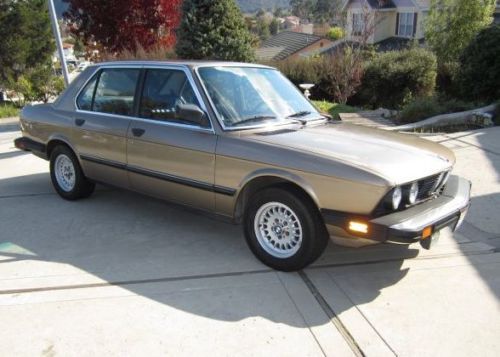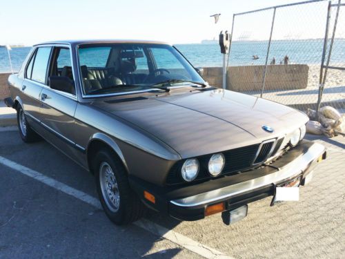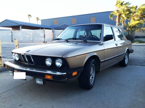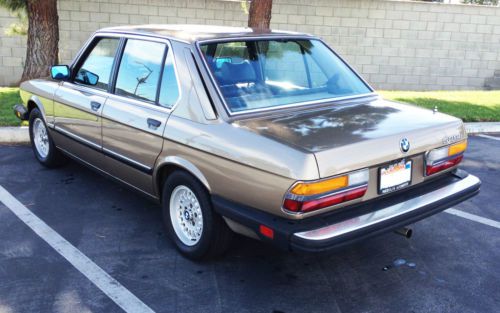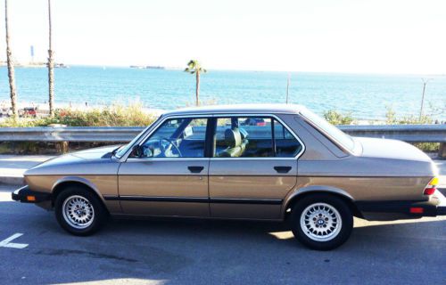 * * PLEASE DO NOT BID ON THIS CAR UNLESS YOU ARE PLANNING ON PURCHASING IT AND HAVE THE MONEY AVAILABLE TO DO SO * * -Thank You -------------------------------------------------------------------------------------------------------- You are bidding on an exceptional example of a classic 1984 BMW 528e. I believe in providing as much detailed information as I possibly can, so here we go: What Makes This 528e Exceptional: * Second Owner car - I just purchased this car from the original owner less than a year ago. That original owner was a pilot and in case you don't know anything about pilots, they are MILITARISTIC when it comes to properly maintaining cars - and he was. * Properly Maintained & Pampered Car - This car has been meticulously pampered it's entire life since ordered from BMW. Oil changes all religiously done every 3K. Previous owner was fanatical about the maintainence of this beauty. And I have spent $4,000+ in just the past few months to make sure the car runs reliably & flawlessly. * Garage Kept - The original owner kept this in an airplane hangar for almost it's entire life, so the paint & body integrity (for it's age) is phenomenal * Low Miles - This car only has 161,000 original miles and drives like it. Feels like a brand new car. Odometer works perfectly so the miles are correct * New Michelin Tires - The tires were replaced with new ones a month before I acquired it. I'd give them about 95-98% tread * New Timing Belt - I just had the timing belt professionally changed at 159,000 by an authorized BMW mechanic. You should be good to go for at least another 60-80,000 miles. * A/C Works Perfectly - The AC works flawlessly and is ice cold * Body is Excellent - Now since this car is driven and is 30+ years old, it would be an exaggeration to say the body is perfect. But considering it's age I'd say it's nearly perfect. Conservatively I'd give it about a 9.5 out of 10. There are only a few tiny typical dings. Nothing major. Specifically no rust, dents, cracks, or major body flaws whatsoever * Title is Clear - Car has never been in an accident. Structurally the car is nearly flawless. Like new * 100% Rust-Free Clean Original Body - This has been a CA car since purchased new in 1984. I cannot see evidence of any oxidation anywhere on the car. Structurally the car is nearly flawless. Looks new to my eyes * Recent Paint - I would give the paint about a 9 out of 10. The original owner said he did have the hood & roof redone in the factory original color because after decades the clear coat started to dull. But from a couple of feet away the paint looks spotless. Under a microscope I think the trained eye of a car collector would be able to tell that those 2 panels have been repainted. It is because os that I conservatively give the paint of the car a score of 9 out of 10. * Excellent Rare Custom "Bahama Beige" Leather Interior - I have never seen this particular BMW leather interior before I bought this car. The original owner told me that he custom ordered this leather so it may very well be one of a kind. On top of that, the overall condition of this leather is excellent especially considering it's age. I would give it about a 9 out of 10. Not perfect, but nearly so. The only flaw I see is a tiny hole in the driver's seat. I priced that fix (if you chose to do it) at $200 for brand new leather. * Sunroof - It works perfectly. Opens & closes with the power switch. Now since I live in LA and we never get rain, I can't say with 100% confidence that it is leak proof. I do have the car professionally cleaned frequently and once or twice I noticed a drop or two of water inside but that is after high pressure water sprayed right onto the roof. So, worst case scenario I'd say the sunroof might leak a tiny bit, but nothing major. * New Headliner - The original owner said he had installed a brand new original color headliner so there is no sagging, discoloration or rips in the headliner. Up top it looks nearly new to my eyes. If any flaw (elaborated below under "Flaws"), the panels to both the left & right of the rear view window look a little aged. * Brand New Brakes at 159K - I had the brakes redone at 159K including new rotors, pads, fluid flush. The brakes stop this car on a dime. Perfect. No squealing, grinding, pulling, vibrations, just tight perfect braking. * New Computer & Electrical Switches - The only intermittent flaw the car had when I bought it was that it wouldn't start immediately once every 100 (or so) starts. So between my mechanic & I we started replacing TONS of electrical parts (which cost thousands of dollars too) We started with ignition/electrical switches, fuses, wiring, safety neutral switch (I think) and ultimately replaced the car's Computer. It was a very expensive minor problem which we finally fixed. The new Computer was the problem. Now the car starts 1st time every time. * New CD/AM/FM/USB/Bluetooth Audiophile Stereo - Being a music lover I did spend quite a lot of money (nearly $1,000) installing a new stereo with new Polk speakers in both front & back. So be advised that the original (Becker?) stereo is not currently installed. I believe it might be stored in the trunk * New Viper Car Security System - I also decided to protect this rare car with a new state of the art Viper car alarm which will actually page your extra remote if the car gets tampered with. Installed by professionals and works flawlessly. * Original Factory BMW Rims - The 4 factory rims looks pretty great overall, but not perfect. I have spent a ton of money every week to have the these detailed rims professionally cleaned. 3 of the 4 looks almost new. But one of them appears to have been scrubbed a little too hard. These rims are easy to find if you simply wanted to replace that one. I would have to give them an overall score of about 8 out of 10. * Suspension Feels & Handles Like New - The original owner said he had replaced the shocks or struts and it really feels like it to me. Car f