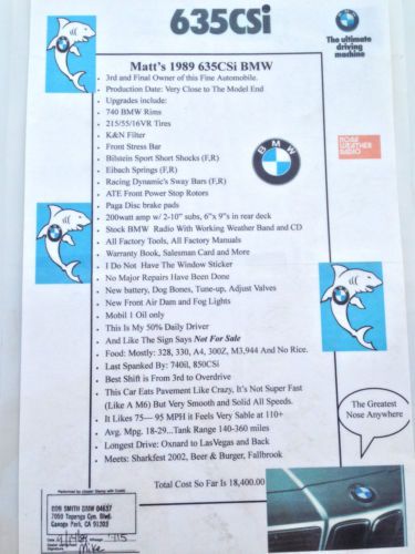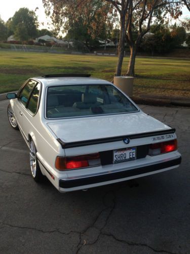 1989 bmw 635 csi last year made!! RARE CLEAN TITLE CALIFORNIA CAR !! ALPINE WHITE OVER TAN. ALL ORIGINAL PAINT !! the body is as straight as can be.The paint is super nice and glossy. There is one ding that wouldn't come out because of a stress bar that is behind the ding.however it is low on the door. the" shark" has the M-TECH WING on the rear. The front air damn is not cracked like most are. new 18" wheels and tires that really make the car pop. they have about 1000 miles on them. the car rides smooth down the road , NO vibrations at all. AC blows cold front and back.. like an 89 would. i had the two front seats reupholstered with leather. also the two front door panels and the rear tray where the speaker pods are. the headliner is very nice. sunroof opens and closes as it should. she has an awesome stereo that rocks when your cruising down the hwy. The only thing i didn't get to was the dash. There are cracks. :-( The drivetrain runs well. Just like an 1989 should. acceleration is nice and smooth and shift as it should. NO OIL LEAKS AT ALL !!! THATS RIGHT , NO LEAKS !! radiator has been flushed and the lower hose has been changed. All the lights and turn signals work as they should. she has new brakes and rotors front and back. BILSTEIN shocks all the way around. front stress bar on top. RACING DYNAMICS sway bars front and back. EIBACH 1.5 LOWERING SPRINGS . she sits nice and rides smooth. 152,xxx on the miles , however the odo stopped working and needs the plastic sprocket gear replaced. the top end was rebuilt in 2010. i have all the service records from 2001 -2013 if you have any questions please ask before bidding!! NO RETURNS AND WILL BE SOLD AS IS . NO WARRANTIES. GOOD LUCK AND GOD BLESS.... |