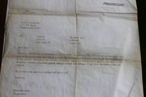 In April 3 1996 The BMW had a total loss claim on the insurance due to the theft recovery, No structural or frame damage reported. I do have that original form from the insurance that is saying: There was no structural damage to the vehicle. Damage to the vehicle consisted of: Right door lock punched, Ignition defeated, column defeated, Interior completely gutted, Damage to the dash and damage to right door to obtain access into Vehicle. This is the exact words it's saying on the progressive claim Form, also on the title it has salvage rebuild. You are welcome to call my mechanic to ask about the car Mike 503-287-0739 or you can choose your own mechanic for the pre-purchase inspection, Please no pre-purchase inspection after Auction ends. Check the pictures before you bid or ask any questions that you will like to know, I will be happy to answer if I know them. I will not end the auction sooner so please don't ask me what is my reserve price, just place a bid on the car if you are a serious buyer. Keep in the back of your mind this is a 25 years old car and I had described the car best of my knowledge. |