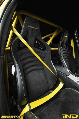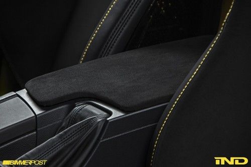 The dash was removed and reupholstered in black leather, again giving the work an original BMW Individual feel that would not detract from the rest of the car. To coordinate with the car’s headliner, the door panels were subtly split and their upper half was refinished in alcantara fabric, while leaving the lower half in original BMW leather to resist wear and maintain the car’s daily usability. A genuine M3 GTS center arm rest was obtained through German contacts at BMW. From the arm rest the eye will travel back to the show piece of the interior- a custom built roll bar, welded in place as one piece by Fall Line Motorsports and finished in Dakar Yellow by IND. A rear closeout was built to resemble the M3 GTS as closely as possible, while adapting the closeout to the different dimensions of the sedan. Finally, yellow seat belts were added to the front of the car, and may be my personal favorite single piece on the car.