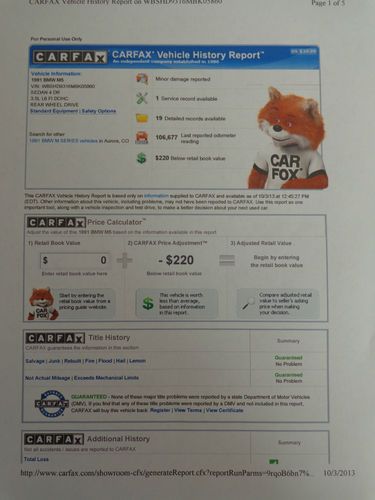 1991 BMW E34 M5 WITH ONLY 109K ORIGINAL MILES. DRIVETRAIN IS IN VERY GOOD SHAPE, MEANING IT RUNS AND DRIVES GREAT AND PULLS HARD, IT'S VERY WELL MAINTAINED WITH SOME SERVICE RECORDS AVAILABLE, BODY HAS NORMAL 22 YEAR OLD WEAR, BUT OVERALL IS IN VERY GOOD CONDITION(SEE PICS), NOT PERFECT. HAS LOTS OF POTENTIAL THOUGH. INTERIOR IS IN IMMACULATE SHAPE WITH NO RIPS OR TEARS IN LEATHER. ALL ELECTRICAL IS IN PERFECT WORKING ORDER. PRICES ON THESE ARE QUICKLY GOING UP, SO HERE IS AN OPPORTUNITY TO OWN A REAL CLASSIC. LAST OF THE HAND MADE Ms.