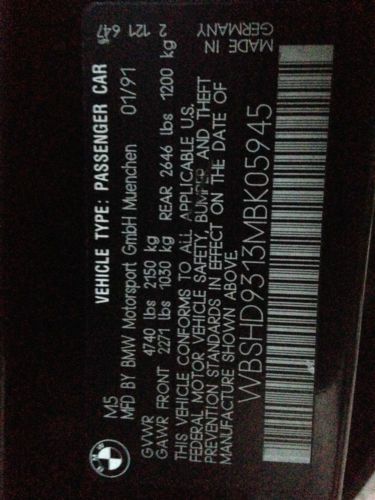 Clean and well taken care of 1991 BMW M5. Car runs and drives great. AC blows cold. All windows, sunroof etc works as they should. Only modification to the car that I know of is the aftermarket stereo. The factory radio is included with the sale. Have two many cars and another one on the way so this one has to go sadly. Known Issues ABS light comes on most of the time. The paint is in very good condition for a 23 year old car but there are some small rock chips and light scratches The driver side door mirror glass has some slight spotting from some kind of delimitation The front door panel insets need to be regaled( look at pics) It is a 23 year old car that has been well cared for and in good condition for its age BUT IS NOT A NEW CAR Comes with two keys, complete set of factory manuals, tool set etc Recent Maintenance Oil and filter was just changed Nov 2013($1200) Power steering pressure hose Power steering return hose Engine mount Bilstein front strut inserts Drive belts Mar 2013 ( $ 2800) Done last year at 132K Brakes flushed Dist cap Rotor button Ignition wires Idle control valve All idle valve hoses Lower intake hose All new drive belts Rear shocks, shock mounts and gaskets ( I believe the self leveling sue was disconnected) Transmission oil change OIL and filter change Sway bar end links Tie Rods Diff oil change Good year Eagle F1 tires with 70-80% tread all around The car is sold AS IS with no warrantee. I do welcome all questions and encourage in person and third party PPI inspections. I have described the car to the best of my knowledge. Please ask all questions before bidding. Thank you and good luck bidding |