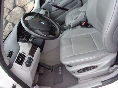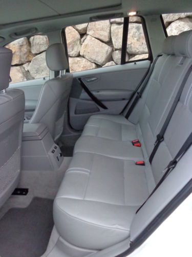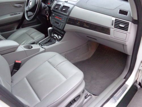 This is a 2007 BMW X3 is White with a gray interior. Standard features include 17-inch chrome wheels, a panoramic moon-roof, automatic climate control, full power accessories, automatic headlights, heated mirrors and key-less entry. Power front seats and a CD player with an auxiliary input are also included. It has a Cold Weather package featuring heated front and rear seats, headlights and a ski bag; and a Premium package that bundles a universal garage door opener, upgraded interior lighting and leather upholstery and lumbar supports for the front seats. This vehicle has always been garaged and