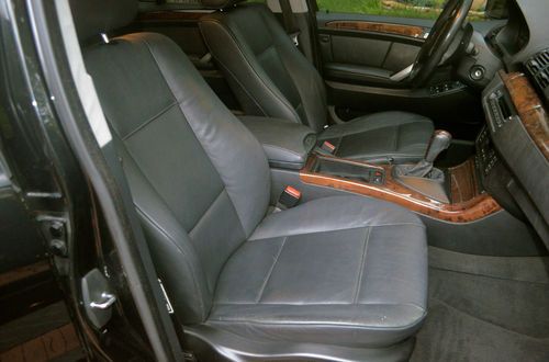 This BMW X5 SUV is beautiful inside and out. For any used auto to be this clean and well maintained it is impressive, but for ten year old cars, it is rare indeed. The leather interior is barely worn; it is more like the amount of wear you would expect to see on an auto that is only a couple of years old. The interior smells fresh, there are no undesirable smells s/a cigarette smoke. The outside looks great also. There are no dents or areas of rust. The only flaw is a small seam/indentation in the vinyl bumper on the front right corner. It is roughly one or two inches long and is hardly noticeable unless you carefully scrutinize the car. I have included a pic of this.