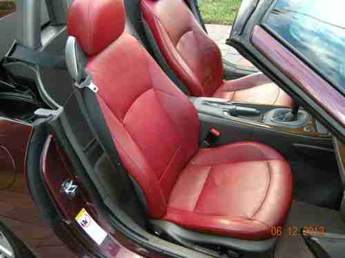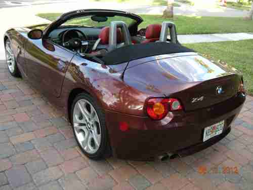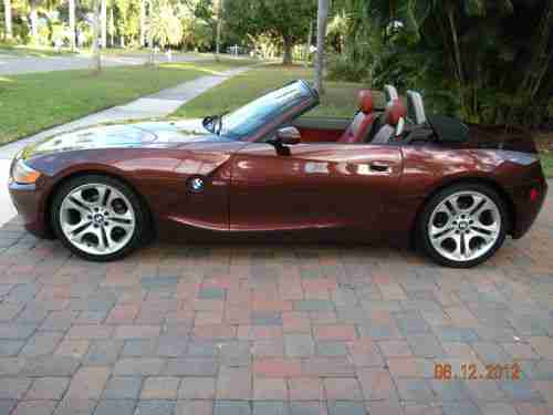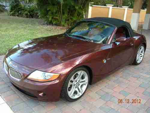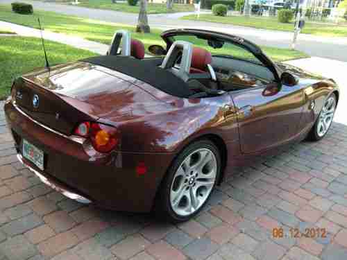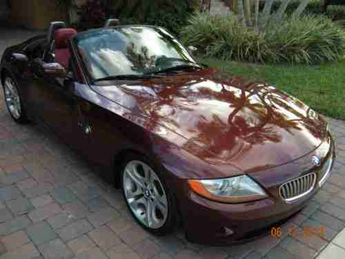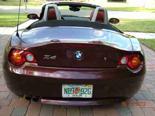 UP FOR AUCTION IS AN AN EXCEPTIONALLY CLEAN 2003 BMW Z4 CONVERTIBLE..1 OWNER FLORIDA CAR..100% RUST FREE..PREMIUM PACKAGE..SPORT PACKAGE..COLD WEATHER PACKAGE..FACTORY POWER CONVERTIBLE TOP..MERLOT RED METALLIC PAINT/BRILLIANT RED LEATHER HEATED SEATS..6 WAY POWER DRIVER'S AND PASSENGER'S SEATS.. 044,183 MILES..6 SPEED TRANSMISSION..3.0 LITER INLINE 6 CYLINDER ENGINE~THIS BMW DRIVES GREAT!! ..PAINT IS EXCEPTIONALLY NICE, EVEN CONSIDERING IT IS 10 YEARS OLD.. BLACK CLOTH TOP LOOKS GREAT..GLASS REAR WINDOW WITH DEFROSTER