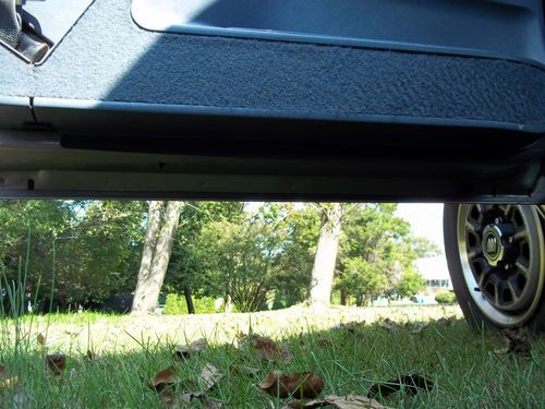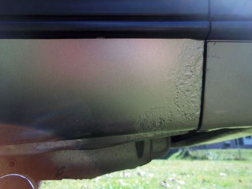 Rusted through area of right 1/4 panel (bottom in back of wheel opening), was bad enough to require a professional repair be done by a local body shop. Bad metal was cut out, new steel was mig welded in place. Body filler was then applied, smoothed and primed. As per owner's request, and to save on repair cost, a spray can of touch-up paint was used to finish the job. Color is pretty close but not exact. Interior area of repair (spare tire location) was seam sealed then undercoated.