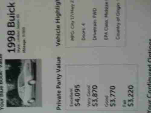 NO RESERVE !!!!! Selling for a older friend who doesn't do computers. EXTREMELY CLEAN And RELIABLE 1998 BUICK CENTURY LIMITED Edition Tan With Tan Leather Interior POWER Seats, Windows, Locks, CD, Cruise, ABS, AIR.....INTERIOR And EXTERIOR Are EXCEPTIONAL!! SHOWROOM SHAPE!!!...They DON'T Come Any NICER Than This ONE!!...91,XXX Miles..Looks and Drives ABSOLUTELY NEW!! ..PLEASE CALL CELL ( 302-540-9366 ) LOW MILES And CLEAN!!! NO RESERVE !!!!!This Car is advertised locally and listing may be discontinued at any time due to local sale. Thanks.