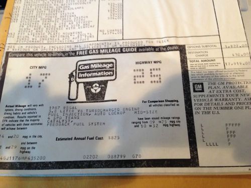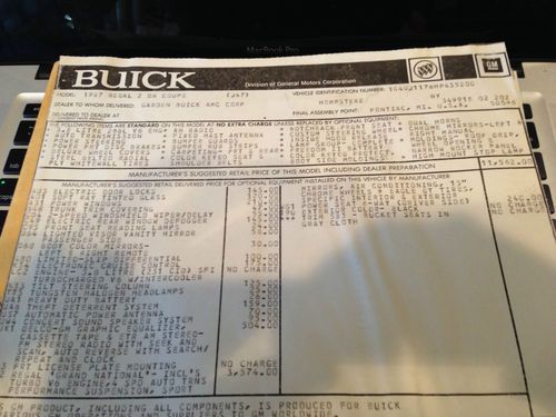 Model: 1987 Buick Regal 2 Dr Coupe VIN:1G4GJ1176HP435200 DEALER TO WHOM DELIVERED: GARDEN BUICK AMC CORP