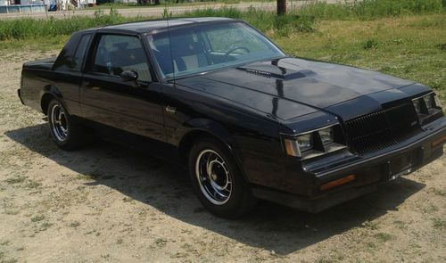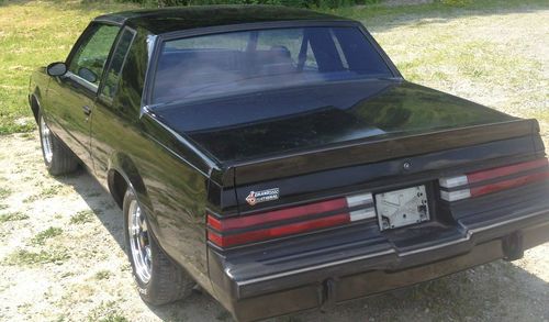 87 Buick Grand National. 82k original miles, all stock except a computer chip, air filter, and adjustable wastegate which were installed in the 90's. Looks great from 20 feet away, undercarriage is solid, floors, trunk, rockers, doors, frame etc are all rust free. Car was driven very little and in fair weather only. Sat under a tree for a while in my driveway so the hood and trunk lid have spots from acid rain or sap or whatever but the sides look great. The tops don't leak. It runs great and has tons of power, the rear end is posi and works, the turbo spools up nice, the transmission shifts perfect. This car has not been restored and it get driven about 500 miles a year so it's not a show queen and you can expect some minor scratches and chips and dings from being over 25 years old. I have the original build sheet showing the Grand National and Hatch Roof options. I also have some oil change receipts showing the mileage is accurate. Clean title. OK now for the negatives - there's a hole in the drivers seat the size of a quarter, the carpet is somewhat worn, some of the interior trim needs restoring, the headliner fabric was sagging so now its gone, its missing one center cap, the 3 is missing on the hood where it says 3.8 litre, there's a scratch on the rear quarter panel I took a close-up picture of it. Manual windows and locks.AM/FM and cassette, no CD player or iphone jack. I was driving it the other day and the red brake light came on and there was no power brakes. My mechanic thinks it needs a new accumulator on the powermaster brake system because there's no leaks in the system and all the brakes look good and the powermaster pump runs. He suggested I just put a normal vacuum brake booster on it but for originality I'll let you decide how to fix it. The air conditioning hasn't worked since 2003, I take the roof off and problem solved. If you are looking for a good driver that you can buy reasonable and are willing to invest some love this is your car. If you are expecting a 100 point show winner this isn't there yet. My kids are older now and would much rather go wakeboarding than sit at a car show so I'm selling this champion to the highest bidder. I have a truck so I can help with delivery within a few hundred miles of zip 14804 for the cost of fuel and expenses. The car is located in western NY state but has never seen salt. I strongly encourage all bidders to personally inspect the vehicle before bidding or send your people over to inspect it, my mechanic can put it on a lift for you to check it over carefully. Someone will have to come by and put cash in my hand before the car leaves here or send a certified check and wait for it to clear before sending a shipping company to pick it up.