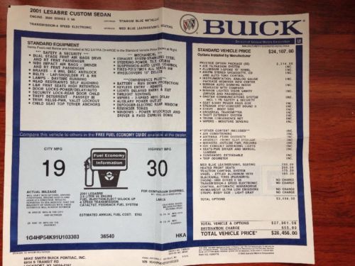 Up for sale is an Excellent mechanical and Very Good cosmetic condition One Owner 2001 Buick Lesabre 3.8 6 Cylinder with Automatic transmission in Titanium Blue Metallic with Blue interior. Vehicle is equipped with power windows, locks, mirrors, and driver and passenger side power heated leather seats. Digital upgraded OnStar with 3 months free Directions and Connections package. AM/FM CD and Cassette. Heater is toasty hot and air conditioner is ice cold. Everything is in good working condition: Good tires, brakes, no damage. Some minor surface rust spots (see photos).Vehicle has 109k and was meticulously maintained at reputable local dealer. Clean Title in hands. Please see pictures for more details.