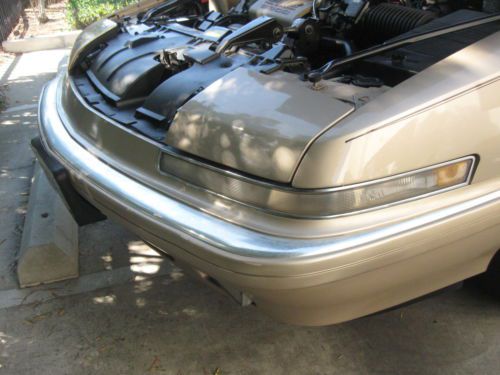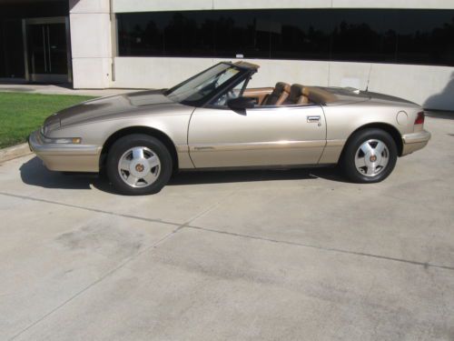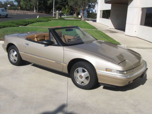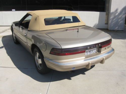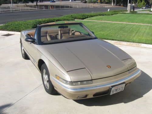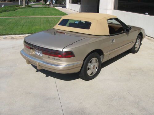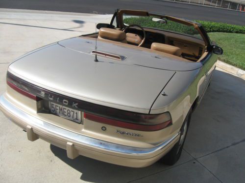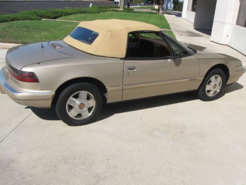 SUPER RARE 1990 BUICK REATTA CONVERTIBLE.ONLY 2132 CONVERTIBLES WERE MADE IN 1990.THE CAR WAS ONLY PRODUCED FOR 2 YEARS(1990-1991).THESE CARS HAVE BECOME VERY COLLECTIBLE BECAUSE OF ITS LOW PRODUCTION.THE CAR HAS ALWAYS BEEN IN CALIFORNIA SINCE 1990,SO IT IS COMPLETELY RUST FREE.IT STILL HAS THE ORIGINAL LIGHT DRIFTWOOD GOLD PAINT.THE PAINT IS IN VERY GOOD ORIGINAL SHAPE.IT DOES HAVE SOME MINOR DINGS,SCRATCHES AND IMPERFECTIONS ASSOCIATED WITH A CAR OF THIS AGE.NO PARTICULAR FADING OR CLEARCOAT ISSUES.THE CAR HAS NEVER BEEN IN ANY ACCIDENTS.THE INSIDE LEATHER INTERIOR IS TAN.IT IS ALL ORIGINAL AND IN GOOD USED CONDITION.THE SEATS HAVE NO RIPS.THE CARPETS ARE IN GOOD CONDITION.THE DASH HAS NO CRACKS.THE TAN CONVERTIBLE TOP IS IN VERY GOOD SHAPE WITH NO RIPS OR TEARS AND HAS THE ORIGINAL GLASS REAR WINDOW WITH THE DEFROSTER IN THE GLASS.THE TRUNK COMPARTMENT LOOKS LIKE IT HAS NEVER BEEN USED.THE SPARE TIRE IS BRAND NEW.THE CAR RUNS AND DRIVES DOWN THE ROAD WITH NO PROBLEMS.IT RUNS ON ALL 6 CYLINDERS AND DOES NOT SMOKE OR HAVE ANY OVERHEATING PROBLEMS.IT IS THE ORIGINAL ENGINE WITH 157K MILES AND HAS NEVER BEEN OVERHAULED.THE ALTERNATOR STILL OPERATES AND CHARGES BUT DOES MAKE SOME NOISES.THE CAR HAS THE ORIGINAL REATTA WHEELS THAT DO HAVE SOME SCRATCHES AND MARKS ON THEM,BUT IN GOOD USED CONDITION.THE TIRES ARE GOOD USED SHAPE.THE DASH GAUGES ALL OPERARTE EXCEPT FOR THE OIL GAUGE.IT READS LOW,BUT THE OIL PRESSURE STILL WORKS FINE AND THE OIL STAYS FULL.IT MIGHT BE A WIRE THAT FELL OFF OR A FAULTY GAUGE LIGHT,BUT DOES NOT HAVE ANY EFFECT ON THE DRIVING OF THE CAR.THE AIR CONDITIONING SYSTEM IS ALL COMPLETE BUT NOT SUPER COLD.IT WILL NEED SOME SERVICING OR FREON REFILLED.THE MECHANICAL HEADLIGHT DOORS OPERATE INTERMITTANTLY AND NEEDS ADJUSTMENT TO OPEN AND CLOSE PROPERLY.THIS IS A GOOD DRIVER QUALITY CAR.IT IS NOT PERFECT AND WILL NEED SOME WORK TO MAKE IT REALLY NICE,BUT IT IS AN HONEST ORIGINAL CONVERTIBLE THAT HAS NOT BEEN ALTERED.