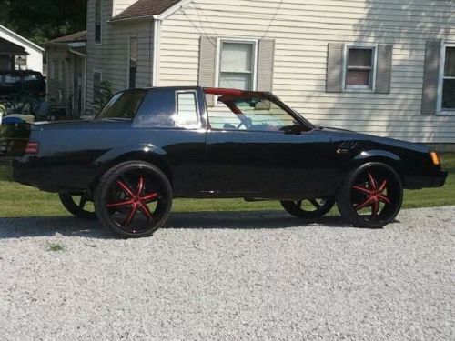 1982 buick regal limited t-top built to resemble a gnx mileage is exempt due to motor swap...car was painted new honda black back in 2009 paint is not a1 has some scratches, car sits on 24in factory black helo 866 rims with paint inserts wrapped in 255/30/24 series tires all tires have about 85% tread left except 1 that is new and hasnt seen any pavement yet has air shocks and adapters in rearend so the wheels could fit without any cutting car has a excaliber 2way pager alarm with door poppers door handles and trunk lid have been shaved has custom gator print interior hid kit with aftermarket headlights all interior plastic painted red could use new paint headliner in good shape has gnx badges hood and fenders ttops do not leak pioneer single din head unit manual windows door and floor boards are good car use to have a boosted 3.8l motor now has a 350chevy which has a blown head gasket i have the gaskets just have not repaired because of to many projects at the moment motor has a mild lunati edelbrock 650 carb with electric choke hooker headers with full true dual exhuast with black chrome tips which run out behind the rear tires ac and heat have been deleted from car 700r transmission with shift kit stock rear end with stock gears front windshield has new glass and was installed professionally due to not running its needs a lil tlc frame is pretty much rust free car will need to be towed preferably a flat bed at buyers expense iam sure there is something i might be forgetting car is sold AS-IS car has alot of money into that the average person would not realize thank you for checking out my posting