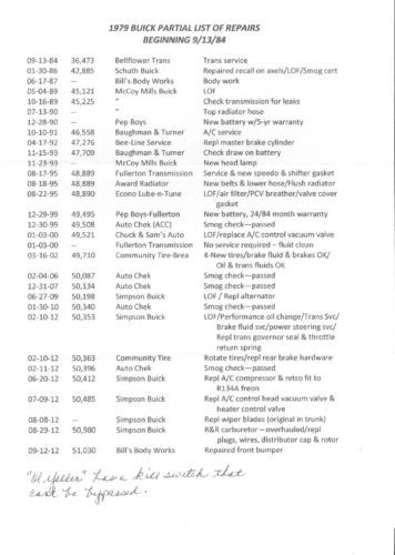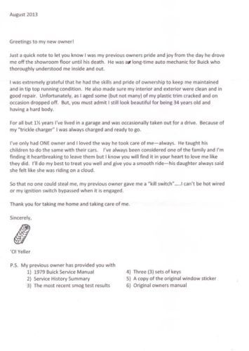 This all original one owner California (1979) Buick Regal has 51,038 actual miles. After obtaining the car we found a lovely letter inside the locked glove compartment in a sealed envelope with all the other documents in the ad. The note for the new owner sums up the superb original condition of this vehicle. We scanned it in below along with the entire history of the car. We thought it was very nice story that should be shared with the community. The car has no issues and is in amazing original condition. Everything works. As stated in the letter the only imperfections are the rear bumper fillers and a dent on the trunk and a few small dents on the roof and one on the drivers fender. Otherwise this car is a gem. This will make the new owner very happy. Remember this is a 5.0L V8 & has the 4 barrel carb, all factory & can be driven ANYWHERE, I have found transporters who will deliver from Phx Az. to the east coast for ONLY $750!! Any ? call me at 602 448-1812 BID with CONFIDENCE