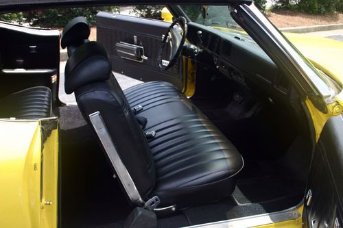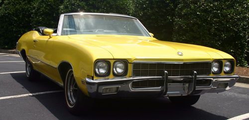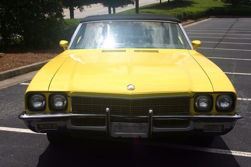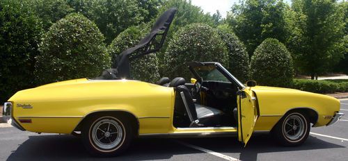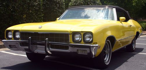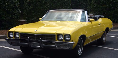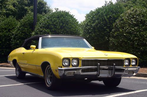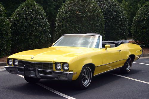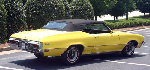 Up for your consideration is a 1972 Buick Skylark Custom. This nice looking Skylark belongs to a friend of mine who buys a lot off E-bay but he has never sold anything, so he asked me if I would. He is the second owner of the vehicle, he bought it over a year ago from one of the original family members who bought it new here in Atlanta in 1972, he has the paperwork to prove that. He began the process of restoring it while he drove it. It has a new top with a glass rear window, new carpet, and a fresh paint job. This is the original color, Sunburst Yellow, but my friend decided to have real metal flake put in the paint so that it sparkles in the sun. I tried to take some pictures up close so you could see the metal flake. This is an all original car except, from what my friend was told by the original owner, they had replaced the original motor with a '72 350 motor from another Skylark that had lower mileage. The car starts and seems to run fine after it warms up. There is no smoke or clatter or any engine noise. I took it out for a cruise yesterday and it seemed to run fine. It would hesitate a couple of times on acceleration but would clear up after about 30-40 MPH and ran fine. All the windows worked fine a week ago, but when I came back home from my cruise yesterday, the front passenger window did not go up, probably a switch and I will do my best to get it checked out this week. The only other issue that I have found with the car is that one of the brakes seems to grab harder than the other. If you hit the brakes quickly it wants to pull to the right but all the brakes are working. My guess is that there is a caliper sticking, having not been driven much in recent months. This is a southern car, so rust is not an issue, the doors are solids, the quarter panels are solid. I took everything out of the trunk so that you could hopefully see that the trunk floor pans are solid. There are some small pinholes in the trunk pans but this is where water had gotten into the trunk, nothing serious. The electric top works fine and closes securely. The interior is in good shape as you can see from the pictures. It is missing the passenger side sun visor, but an easy fix, it is also missing the belt on the air conditioner but is otherwise intact. This is a great looking convertible that you could drive while you finish the restoration. My friends situation has changed and needs to sell this car and is putting a reasonable reserve on it so that it will sell. Because of the age of the car, it is being sold "as is" with no warranty implied or stated. If you need the car shipped, I will be glad to deliver it to the shipper if you make the arrangements and the car is paid for. Please ask all your questions before bidding and please only bid if you intent to purchase the car. I will do my best to respond to your questions as quickly as I can. There is a $500 non-refundable deposit to be paid within 48 hours of the auction end and you can contact me in regards to the balance. Thanks for your interest and have a great day.