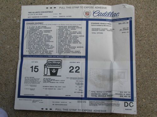 I ordered this car from factory. It has been in my possession from day 1. It is garage kept and stored winters. New tires. Digital dash. I changed air condition from r12 to 134A, This car is immaculate! I am selling the car because I never drive it. I just start it and drive it around the block and put it back in storage. It just doesn't make since to keep it. I am 68 years old I just don't need the car. ONLY 1,931 CADILLAC ALLANTE ROADSTER'S WERE MADE IN 1992 FACTORY ORIGINAL new car window sticker. it comes with its FACTORY ORIGINAL leather bound owners portfolio containing the FACTORY ORIGINAL 1992 Allante owners manual, 1992 maintenance booklet and its 1992 assurance booklet.