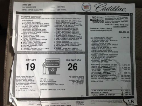 One owner, non-smoking, car with 70,000 miles has always been garaged and maintained with Mobil 1 synthetic oil. Includes original 2003 vehicle brochure and window sticker. This is a very limited color that was only available the first year of production for the CTS. 3.2 L V6, 5-Speed Manual Trans, Luxury Sport Package, Bose Music System w/Cass & CD Changer, Express Sunroof, HID headlamps, Heated Front Seats, 4,000 miles on new Michelin Defender AS tires. Located in Dixon, Illinois and can be shown at any time. If any questions, please call 815-440-1366.