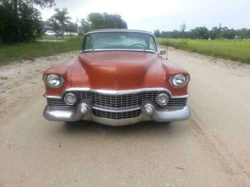1954 Cadillac DeVille 2 door Hardtop Engine: 1979- 350 Chevy engine NEW Parts: One wire alternator,water pump, oil pump,seals gaskets, NO leaks. HEI ign. Aluminum radiator,electric fan,timing chain,Eddelbrock 600cfm carb., Carter Fuel pump.Custom exhaust front to back, Transmission:Chevy 350Th automatic transmission,rebuilt in Feb.2014.External trans cooler, new driveshaft professionally built and balanced Brakes: Drums all 4 corners rebuilt, rebuilt brake master cylinder,all new lines Chassis: Frame is solid with no damage,Rebuilt Steerring box, Lower front control arm spacer blocks. Rear is lowered with 4" blocks and has air shocks. Tires: Diamond Back radial tires all around 15" Interior:Solid floor front and back, trunk is solid Headliner and bows, seats, door panels all original and in great driver shape Front and rear seatbelts installed for family crusin' Side windows go up and down with factory switches, windsheild and back glass are in great shape only fogged around edges Exterior: All trim accounted for and usable,bumpers front and back complete, rear extensions will need work. Clear Florida Title Cons:Amateur rust repair done by previous owner Rust popping through lower edges of body and doors and roof SEE PICS Original engine and transmission are long gone *******SEE PICTURES AND ASK QUESTIONS****** __________________________________________________________ This car is a running, driving, stopping Cadillac NO funny business get in and drive as is, or customize or restore to your liking. No Warranties, guarantees expressed or written AS IS SALE. $1,000.00 DEPOSIT DUE WITHIN 3 DAYS OF AUCTION SHIPPING IS WINNER'S REPONSIBILITY WINNER DOES ALL FOOTWORK AND PHONE CALLS TO SET UP SHIPPING. I CAN HELP LOAD OR DROP OFF AT LOCAL SHIPPING YARD On Sep-09-14 at 15:49:30 PDT, seller added the following information: RESERVE MET CADILLAC WILL SELL, BID TO WIN. LEAST EXPENSIVE RUNNING DRIVING STOPPING 1954 CADILLAC ON EBAY. FOR THOSE WHO ASKED "YES" IT CAN BE DRIVEN HOME. HOOD EMBLEMS, TRUNK EMBLEMS, ALL LETTER EMBLEMS ARE GONE. TEXT OR CALL LENNY 561-236-4829 CADILLAC HAS BEEN IN HIS FAMILY ABOUT 10 YEARS |