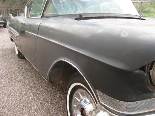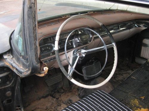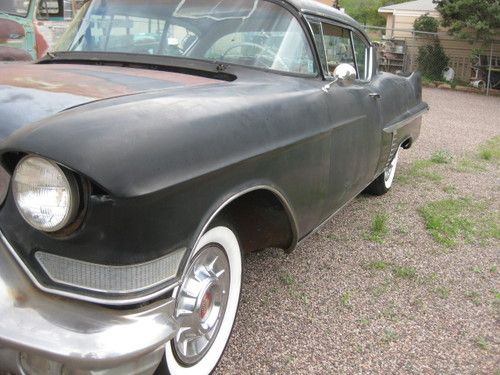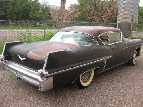1957 Cadillac Coupe DeVille 2 door hardtop, original black car, excellent body. Original pink and black interior, this car is an original black car and I don't think it's ever been painted since new. The pink and black interior is also original. This car hasn't been on the road in 35years. It's been stored in the dry Arizona desert. The floors and the quarter panels and rear trunk floor are in excellent condition, check out the photos. No rust out!!! This car is an excellent candidate for restoration, or you can do the interior and make it a patina flat black. This car is missing the engine and all engine components including the radiator. The car does have power steering and power brakes, Power seat and power windows as well. This car was purchased from an estate the owner had passed away and the car sold. I have no idea where the original engine went. I have a friend that has a complete 1956 engine with factory A/C along with all components that can be purchased at an additional cost, if the winner bidder is interested. Sold as is, buyer responsible for shipping. Do NOT bid on this car if you have an ebay feedback score of less than 5. If you do bid and do not contact me first I'll remove your bid... Happy bidding.