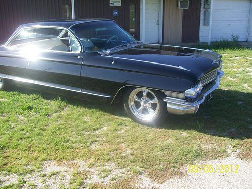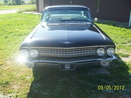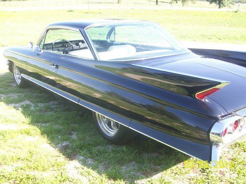 1961 CADILLAC 2 DOOR HARD TOP DE VILLE, CUSTOM INTERIOR, ORIGINAL 390 CADDY ENGINE AND AUTO TRANNY, NO A/C (WAS NEVER ON THE CAR) 17" AFTERMARKET WHEELS, GOOD RUBBER, DRIVERS SIDE GLASS IS CRACKED AND WILL NEED REPLACED, ALL OTHER GLASS IS GOOD, RUNS GOOD AND DRIVES VERY GOOD, POWER STEERING, POWER BRAKES, POWER WINDOWS. ORIGINAL COLOR WAS WHITE BUT NOW 2 YEAR OLD BLACK PAINT JOB, ALL THE LIGHTS WORK, ALL THE GAUGES WORK, BRAKES WORK GOOD. THIS CAR IS NOT A SHOW PIECE JUST A VERY GOOD QUALITY DRIVER. THE ORIGINAL ENGINE DOES RUN GOOD BUT IT STARTING TO SHOW IT'S AGE, THE WATER PUMP LEAKS A LITTLE IF YOU LET IT SIT, THE ENGINE DOES LEAK A LITTLE OIL IF YOU LET IT SIT. BUT I BELIEVE YOU COULD DRIVE THIS CAR ANYWHERE YOU WANTED WITHOUT PROBLEMS, I HAVE PUT MANY MILES ON IT.