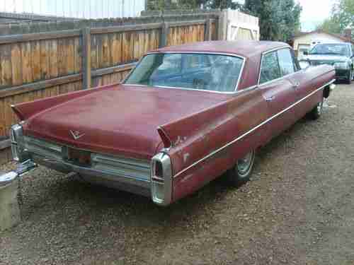 I have a 1963 Cadillac 4-Door Coupe DeVille with 69,538 miles in Original Condition. Car starts and idles excellent, and drives well also. It currently has a transmission front seal leak and will need to be transported, can be driven easily for loading. The only thing I can see missing is the trunk lock, it has been removed and the trunk opens easily with a screwdriver. The ignition switch has been replaced also, the original switch is in the glove box. I'm guessing the keys got lost is why the locks are removed. I acquired this car in trade and the person I got it from acquired it when he bought a farm, it was stored in one of the barns. He was able to get a clear title and there were also service records with the car. It has some mice damage on the interior from it's stay in the barn, I have cleaned it up but it needs a head liner, new carpet, and seats re-upholstered. All chrome is intact, looks like possibly an old repair on the passenger rear quarter panel, and 2 fist size spots of rust on the front quarter panels right where you would expect them. Has great tires and a good battery, good brakes, radio and antenna work, front windshield is cracked, all other windows in great shape and all window and door knobs and handles work well. When the ignition switch was installed, the generator light comes on when the key is off, I think one wire may be on the wrong ignition post. Car has a few minor issues, but a very straight solid no rust car in complete condition. Great restoration project or with a little work a great daily driver. Any questions, please email me. We are located in Longmont, Colorado and local pick-up only for this car.