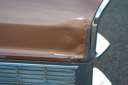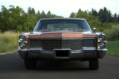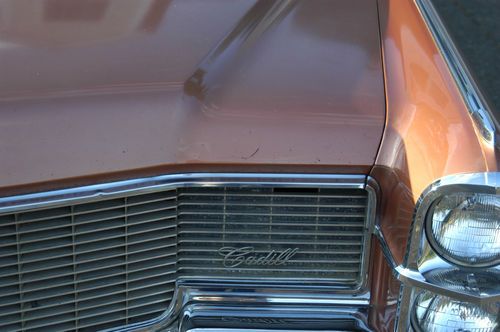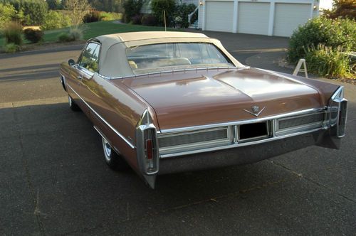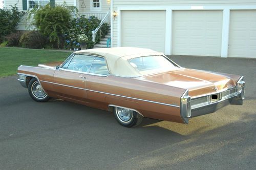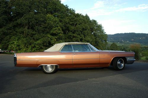 Very original and complete '65 Cadillac Deville convertible. This car has been stored in a dry garage for over 30 years. My father-in-law bought it in '67 and it was the family car until the late seventies when the engine developed problems. He had the engine rebuilt professionally but it was shortly after that he decided to get a newer Cadillac. So the car has been garaged every since. The car drives OK but will probably need at least a tune up (points, cap, wires, etc), a top, and new brakes to make it road-worthy. I suspect the suspension bushings have proably dried up by now also. Overall the car could be made into a solid driver that looks good from 10ft with very little effort. Beyond that it would be an excellent candidate for a restoration due to the straight body, very little rust and a good running engine.