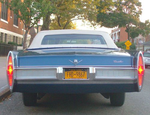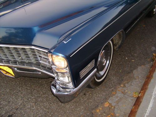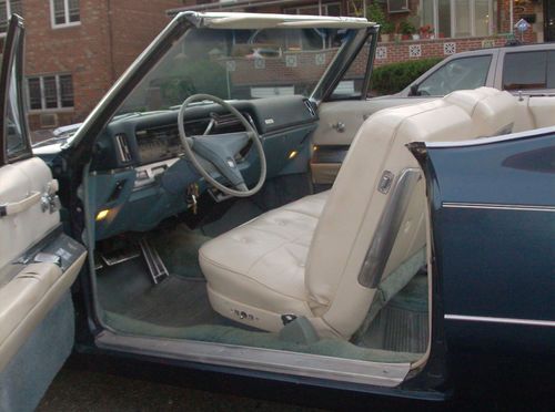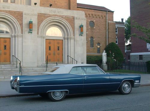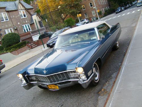 1967 Cadillac DeVille Convertible. Beautiful colors. Dark metallic blue with nice original white leather interior. Nice white convertible top in perfect working order. Goes up and down quickly. All four electric windows operate properly. Power seats. Nice tires with all original wheels. Beautiful design. Recently passed NY State inspection. Very solid underbody and floors etc. The trunk floor is excellent as well (see last picture) Many options including air conditioning and electric eye. All four original blue rubber Cadillac floor mats in good shape. Sherwood cassette stereo system. Thank you. 718 486-3271 Long Island NY