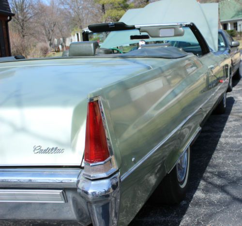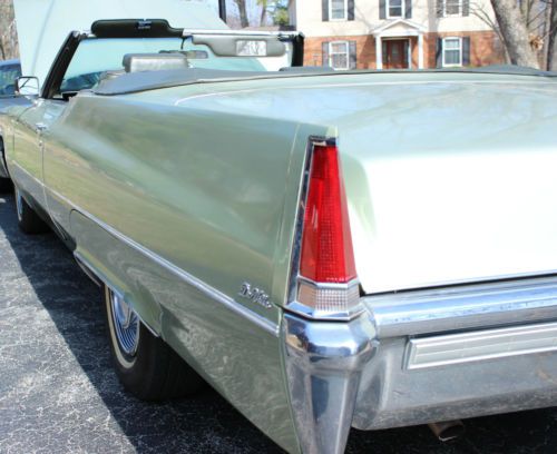 1969 Cadillac DeVille Convertible- Great looking car! 43,000 original miles. Original green paint, green leather seats, and white convertible top. Has power windows, seats, convertible top, & antenna. Newer exhaust system from engine to rear of car, newer four tires, spark plugs & wires, distributor cap & rotor, & master cylinder. Great running car!