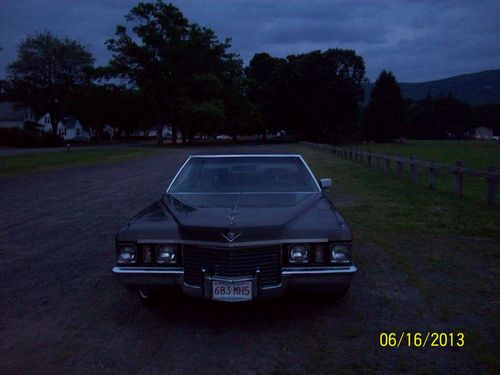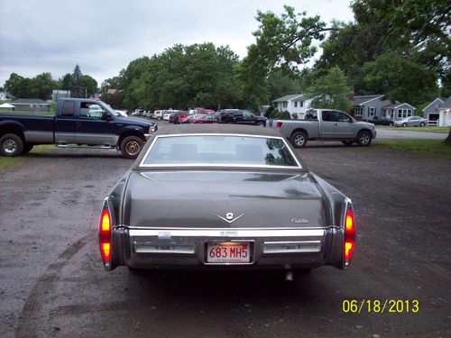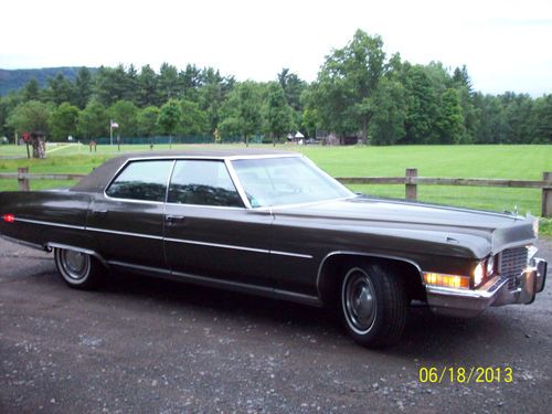 For sale a 1972 Cadillac Sedan DeVille. I am the second owner, and I have all of the car's original sales documentation and owner's manual, and a Service Manual I purchased myself. All lights, including reverse lights are working, and the horn works. The car has a new battery, alternator, water pump, spark plugs, cap,rotor and wires. Front tires are new, original spare still in trunk. The interior was all four original floor mats with Cadillac insignia. The left front fender had rust in the lower part behind the wheel. It was fixed PROPERLY by bending up a piece of metal and welding it on, not filling it with body filler. The only filler used was to dress the weld area. There is some rust in the wheel well and fender skirt area that should be addressed. The roof rail weatherstrips should also be replaced. This car is on the road and drives. It runs well and does not create any smoke or consume oil, and still has plenty of pep for a 1972 with close to 125,000 miles. The odometer reads 123k, but the speedometer stopped working recently. The cable, or the gear at the transmission has failed, and both are a relatively inexpensive fix on this car. I keep the car garaged, and do not drive it in the rain or weather. This was a top quality car when it was built, which has allowed it to survive this long time. With some work and paint, this could be an excellent car, or do the basics and just enjoy driving it!