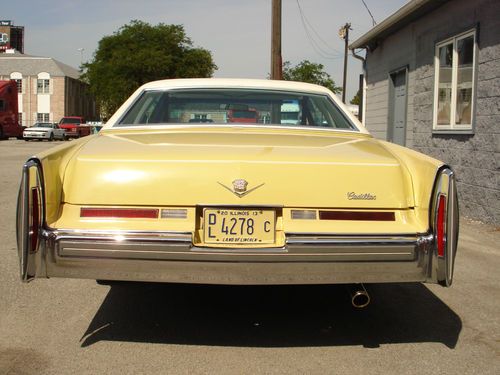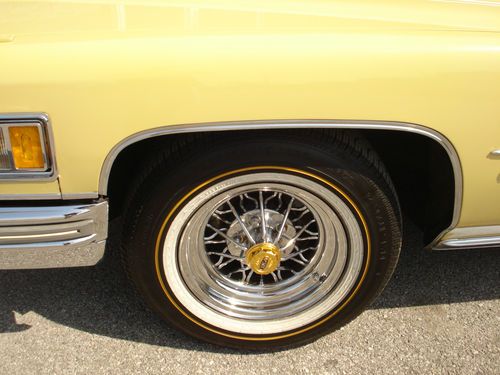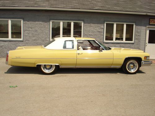 1975 Cadillac Coupe de Ville a "True Survivor" in Mint Condition. Beautiful Bombay Yellow Paint with a White Landau Top and White Leather Interior. Original Spare Tire Never been used. This car is loaded with all the options.
